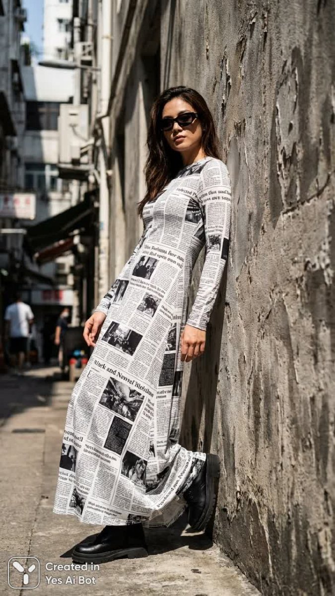 Элегантная женщина в облегающем коротком платье с оригинальным принтом газетных шрифтов демонстрирует безупречный стиль на фоне серого бетонного фасада. Длинные рукава подчеркивают изящность фигуры, а уверенная поза создает атмосферу силы и уверенности. Фотография выполнена в высоком разрешении, с акцентом на реалистичность деталей, что позволяет рассмотреть каждую складку ткани и текстуру поверхности. Использование объектива 85 мм обеспечивает естественную перспективу и мягкое размытие фона, фокусируя внимание исключительно на модели. Композиция построена по строгому прямому углу, подчеркивая симметрию и графичность кадра. Контраст между темным фоном и светлым принтом платья создает визуальную динамику, добавляя образу выразительности и глубины. В целом, фотография представляет собой яркий пример современной модной съемки в городском стиле, сочетающий в себе эстетику классической элегантности и современный урбанистический дух. Она отражает тренд на смелые принты и минималистичные силуэты, подчеркивая индивидуальность и уверенность женщины в современном мире. Этот образ идеально подходит для модных журналов или рекламных кампаний, стремящихся передать ощущение утонченности, силы и современного вкуса