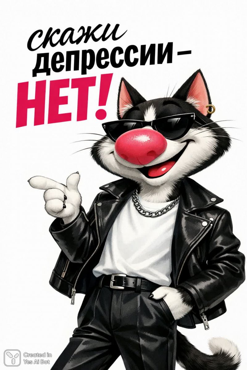 Веселый и жизнерадостный рисунок кота станет отличным напоминанием о том, что не стоит поддаваться плохому настроению. Милый мультяшный персонаж с большим носом широко улыбается на фоне чистого белого полотна, излучая позитив и оптимизм. Надпись 'Скажи депрессии - НЕТ!' добавляет мотивации и призывает к борьбе с негативными эмоциями. Простая и лаконичная иллюстрация выполнена в юмористическом стиле, что делает ее легкой для восприятия и располагающей к себе. Этот образ идеально подойдет для использования в качестве обоев на телефон, открыток или просто для поднятия настроения в течение дня. Кот-антидепрессант станет отличным символом борьбы с печалью и напоминанием о необходимости заботиться о своем ментальном здоровье. Его дружелюбное выражение лица и забавная внешность не оставят равнодушными даже самых грустных людей, даря им улыбку и ощущение легкости. Это прекрасный способ визуально выразить позитивный настрой и вдохновить окружающих на борьбу с негативными эмоциями. Яркий и запоминающийся персонаж станет талисманом для тех, кто стремится к счастью и гармонии