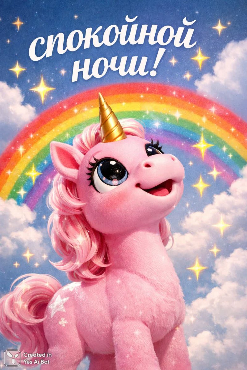 Милый розовый единорог в мультяшном стиле приглашает отправиться в волшебный мир сладких снов. Его большие выразительные глаза смотрят вверх, к мерцающему звездному небу, а вокруг искрится яркая радуга, создавая атмосферу безграничного счастья и позитива. Простой и лаконичный дизайн подчеркивает очарование этого сказочного персонажа, а надпись Спокойной ночи! дарит ощущение тепла и уюта перед сном. Единорог словно шепчет о приключениях в стране грез, где все мечты становятся реальностью. Эта иллюстрация идеально подойдет для детской комнаты, открытки или любого предмета декора, создавая атмосферу радости и волшебства. Яркий розовый цвет единорога, контрастирующий с сине-фиолетовыми оттенками ночного неба, привлекает внимание и вызывает приятные эмоции. Юмористическая атмосфера рисунка располагает к улыбке и помогает расслабиться после долгого дня. Этот единорог – настоящий символ сказки, дружбы и веры в чудеса, который станет прекрасным подарком для детей и взрослых, любящих волшебные истории. Он излучает доброту и позитив, даря ощущение спокойствия и умиротворения. Погрузитесь в мир грез вместе с этим очаровательным единорогом и пусть ваши ночи будут наполнены самыми прекрасными снами!