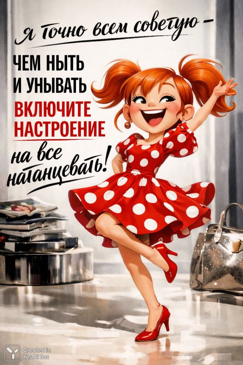 Задорная рыжеволосая красотка в игривом красном платье с белым горошком заряжает позитивом! Эта мультяшная девчонка не знает печали, ведь её жизнь – это непрерывный танец. Она призывает всех забыть о грусти и унынии, включить своё внутреннее настроение на максимум и просто отрываться под любимую музыку. Её энергия заразительна, а движения полны радости и оптимизма. Эта очаровательная танцовщица – настоящий лучик солнца, способный развеять любую хандру и подарить искреннюю улыбку. Почувствуйте ритм жизни вместе с ней! Не тратьте время на жалобы и негативные мысли, а наполните каждый момент движениями и весельем. Позвольте себе быть счастливыми и танцевать от души, как эта неунывающая рыжая красавица. Это призыв к действию, вдохновляющий на позитивные перемены и радость каждого дня. Она – символ беззаботности и оптимизма, готовый поделиться своей энергией со всем миром. Просто включите своё настроение на танцы! Её девиз: 'Не ныть и унывать, а танцевать!' - это отличный совет для всех, кто хочет добавить красок в свою жизнь и ощутить вкус настоящей свободы. Наслаждайтесь моментом и двигайтесь вперед с улыбкой!