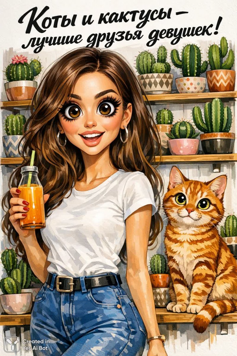 Забавная иллюстрация, запечатлевшая милый момент дружбы между девушкой и ее необычными компаньонами – котами и кактусами. В центре внимания очаровательная девушка в стильном повседневном образе: яркие синие брюки и простая белая футболка подчеркивают ее естественную красоту, а широко раскрытые глаза выражают искреннее удивление и восторг. Она замерла с большой бутылкой сока в руках, словно наслаждаясь приятным отдыхом в компании своих любимых питомцев и растений. Фон картины выполнен в уютном домашнем стиле: полки украшены разнообразными кактусами разных форм и размеров, создавая атмосферу спокойствия и гармонии с природой. Рядом примостился рыжий кот породы табби – настоящий хозяин дома, с гордо поднятой головой и внимательным взглядом, словно наблюдающий за происходящим вокруг. Надпись 'Коты и кактусы - лучшие друзья девушек!' добавляет картине юмористический оттенок и подчеркивает ее позитивный посыл. Вся композиция пронизана легкостью и беззаботностью, вызывая улыбку и создавая ощущение тепла домашнего очага. Идеально подходит для тех, кто ценит чувство юмора, любит кошек, кактусы и девушек. Эта забавная иллюстрация станет прекрасным украшением интерьера или оригинальным подарком для друзей и близких