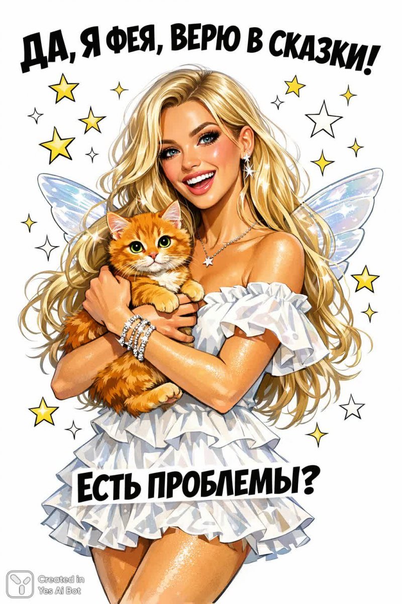 Волшебная фея, сотканная из света и радости, парит в мерцающем облаке звезд. Её длинные, пшеничные локоны развеваются невесомым ветерком, а крошечные крылышки игриво подрагивают, словно отражая восторг её сердца. В ладонях нежной феи уютно пристроился рыжий котенок – пушистый символ домашнего тепла и безграничной любви. На фоне чистого, белоснежного полотна яркими красками выведена надпись: 'Да, я фея, верю в сказки! Есть проблемы?'. Эта фраза словно приглашение к волшебству, обещание решения самых сложных задач с помощью доброй силы и позитивного настроения. Рисунок выполнен в динамичном комиксном стиле, где каждая деталь наполнена энергией и оптимизмом. Глаза феи искрятся весельем, а её улыбка обещает поддержку и вдохновение. Звезды вокруг неё не просто украшение – это частички волшебства, готовые прийти на помощь каждому, кто верит в чудеса. Это изображение – воплощение надежды, веры в себя и уверенности в том, что даже самые невероятные мечты могут сбыться. Оно излучает теплоту, доброту и задор, создавая атмосферу сказочного счастья и безграничных возможностей. Погрузитесь в этот мир волшебства и позвольте фее подарить вам частичку своего света!