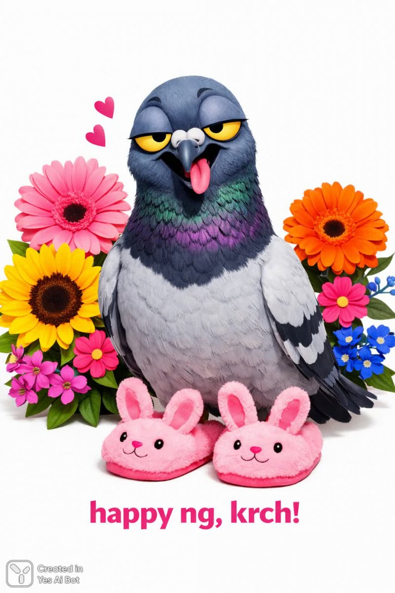Забавное поздравление с Новым годом! На изображении представлен очаровательный мультяшный голубь, который несомненно поднимет настроение. Его розовые тапочки-bu y добавляют игривости и милоты этому пернатому герою. Вокруг голубя раскинулся буйство красок – яркие цветы создают атмосферу праздника и радости, а их разнообразие подчеркивает жизнерадостность момента. Морда у птички получилась невероятно смешной и выразительной, что только усиливает общее впечатление от картинки. Белый фон позволяет выделить ключевые элементы композиции, делая акцент именно на голубя и его окружение. Текст 'Happy NG, KRCH!' внизу служит прямым поздравлением с Новым годом и подчеркивает личный характер послания. Яркая палитра цветов и минималистичный стиль делают изображение современным и привлекательным для широкой аудитории. Это идеальное решение для новогодней открытки или просто чтобы порадовать близких забавной картинкой, передающей тепло и позитивные эмоции в преддверии праздника. Изображение вызывает улыбку и дарит ощущение легкости и веселья, что делает его отличным способом поздравить с наступающим Новым годом!