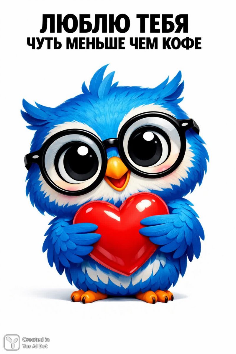 мультяшная смешная синяя сова в круглых черных очках, держит красное сердечко, надпись сверху "люблю тебя чуть меньше чем кофе", минимализм, яркие цвета, смешной стиль