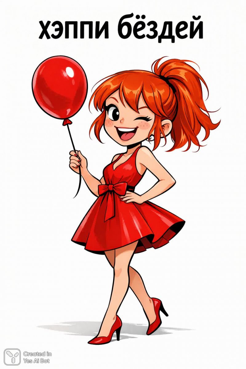Текст: "Хэппи бездей", смешная рыжая мультяшная девчонка в красном платье и с красным шариком в руке, минимализм, комикс стиль