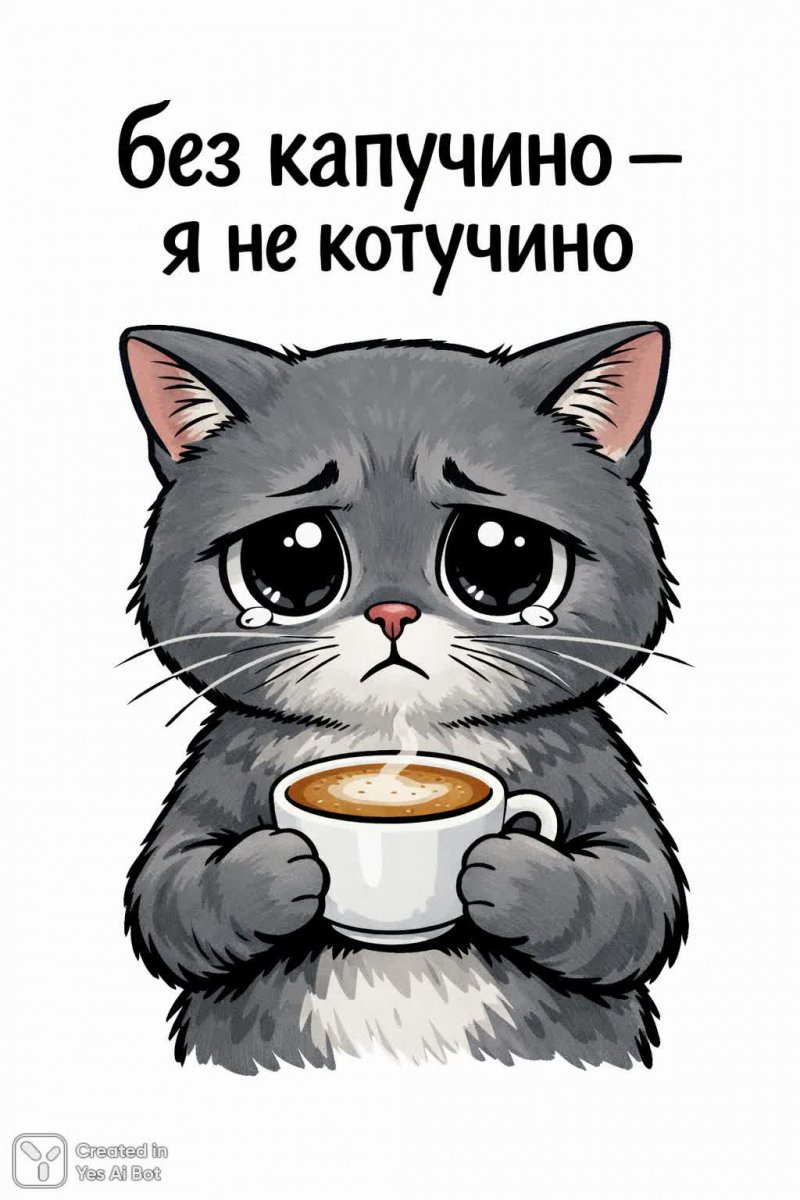 Этот милый и немного печальный персонаж точно вызовет улыбку. Грустный серый кот с огромными выразительными глазами запечатлен в стильном минималистичном изображении. Он уютно устроился с чашкой ароматного кофе, словно размышляя о бренности бытия или просто нуждаясь в утреннем тонике. Надпись 'без капучино – я не котучино' добавляет картине юмора и игривости, создавая комикс-атмосферу. Белый фон подчеркивает лаконичность композиции и фокусирует внимание на очаровательном коте. Изображение выполнено в современном стиле, сочетая в себе элементы минимализма и комиксов, что делает его визуально привлекательным и запоминающимся. Это идеальный способ поднять настроение или добавить немного кошачьего юмора в ваш день. Несомненно, такой рисунок станет отличным украшением для социальных сетей, открыток или даже кружки с кофе – ведь кто откажется от компании такого милого и забавного кота? Его взгляд полон тоски, но при этом он излучает позитив, напоминая о том, что даже в самые серые дни можно найти повод для смеха и насладиться простыми радостями жизни, например, чашечкой кофе. Это произведение искусства – прекрасный пример того, как сочетание юмора и трогательности может создать незабываемый образ