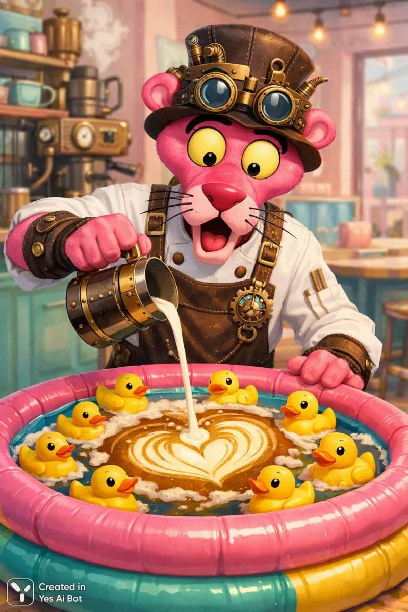 pink panther as steampunk chef barista, pouring latte art into a mini inflatable pool full of rubber duckies, wild surprised eyes, pastel urban cafe background, cartoon style, bold colors, humorous, funny, exaggerated expression, soft lighting