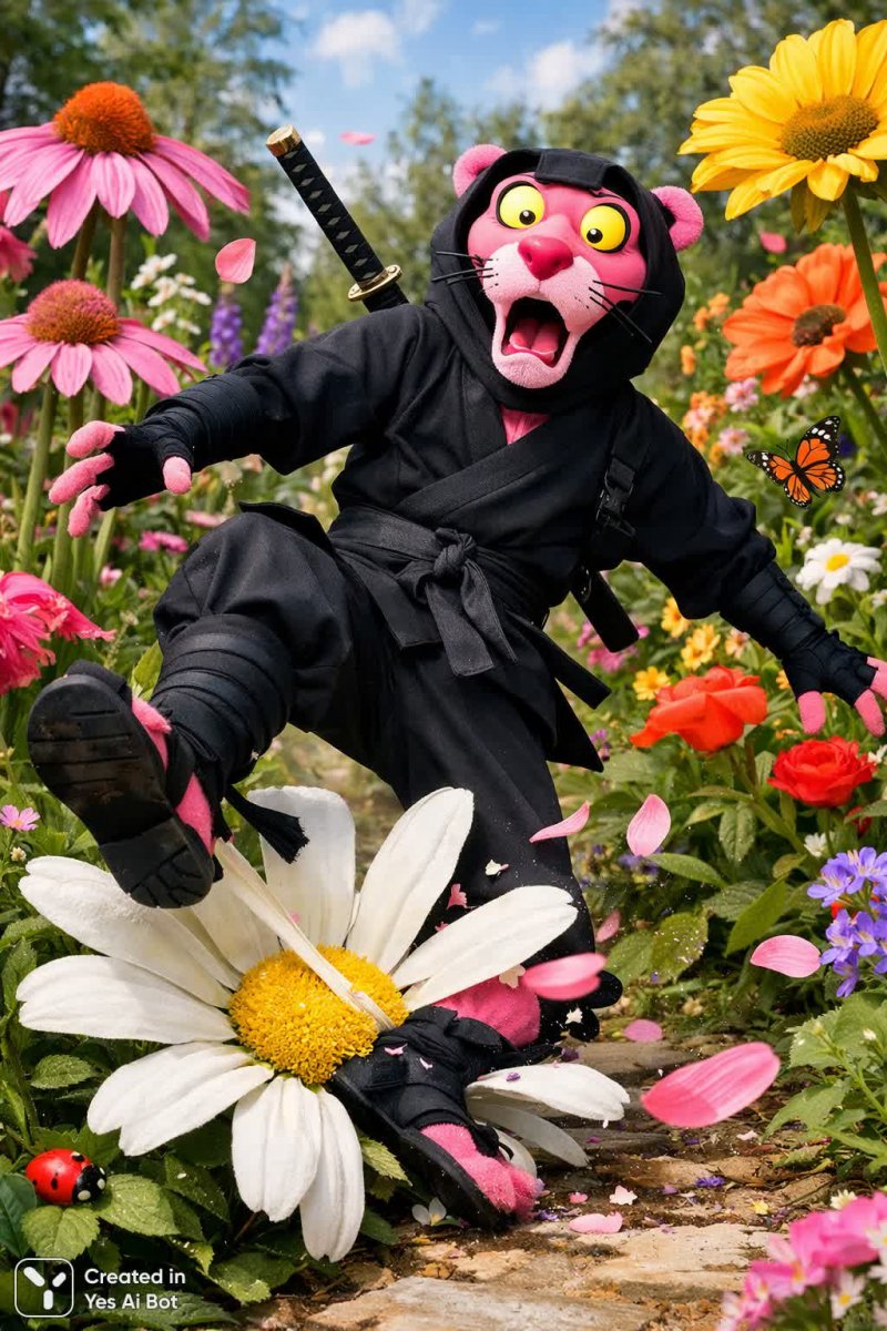 pink panther in a playful ninja outfit sneaking through a garden, comically tripping over oversized flowers, shocked expression, colorful garden backdrop, funny and chaotic atmosphere, humorous.