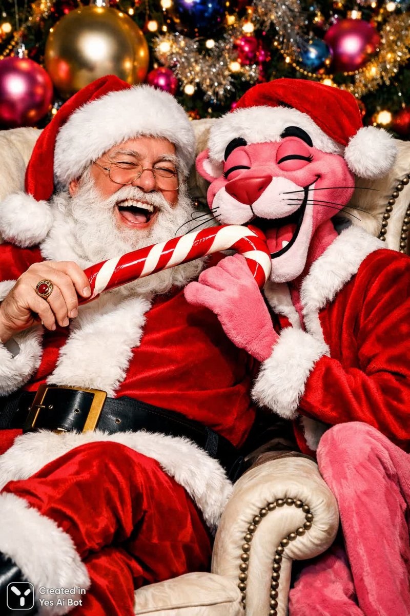 santa in a cozy chair with pink panther wearing a festive santa hat, sharing a giant candy cane, both laughing, background of colorful ornaments and twinkling lights, humorous expression, cartoon style, bold colors.