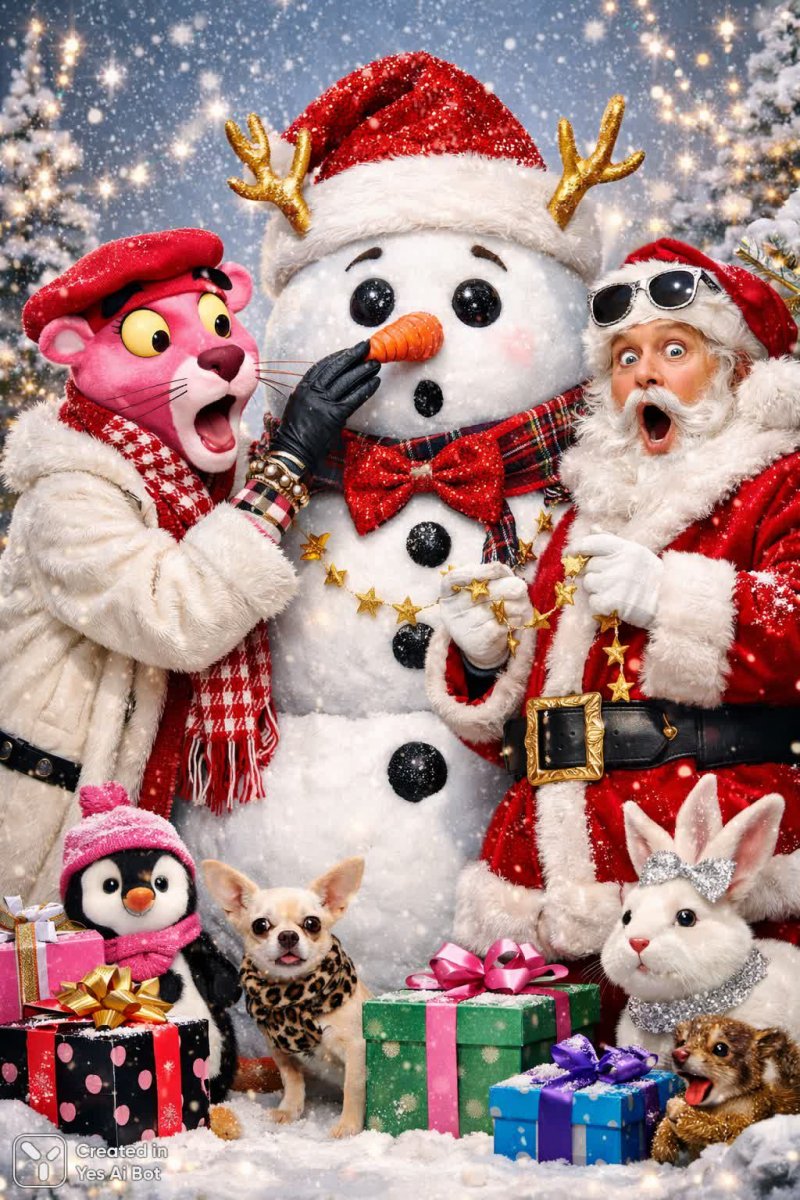 pink panther decorating a giant snowman with santa, both with wild, surprised faces, sparkly winter scene featuring colorful gifts and playful animals, cartoon style, funny expressions, bright colors.