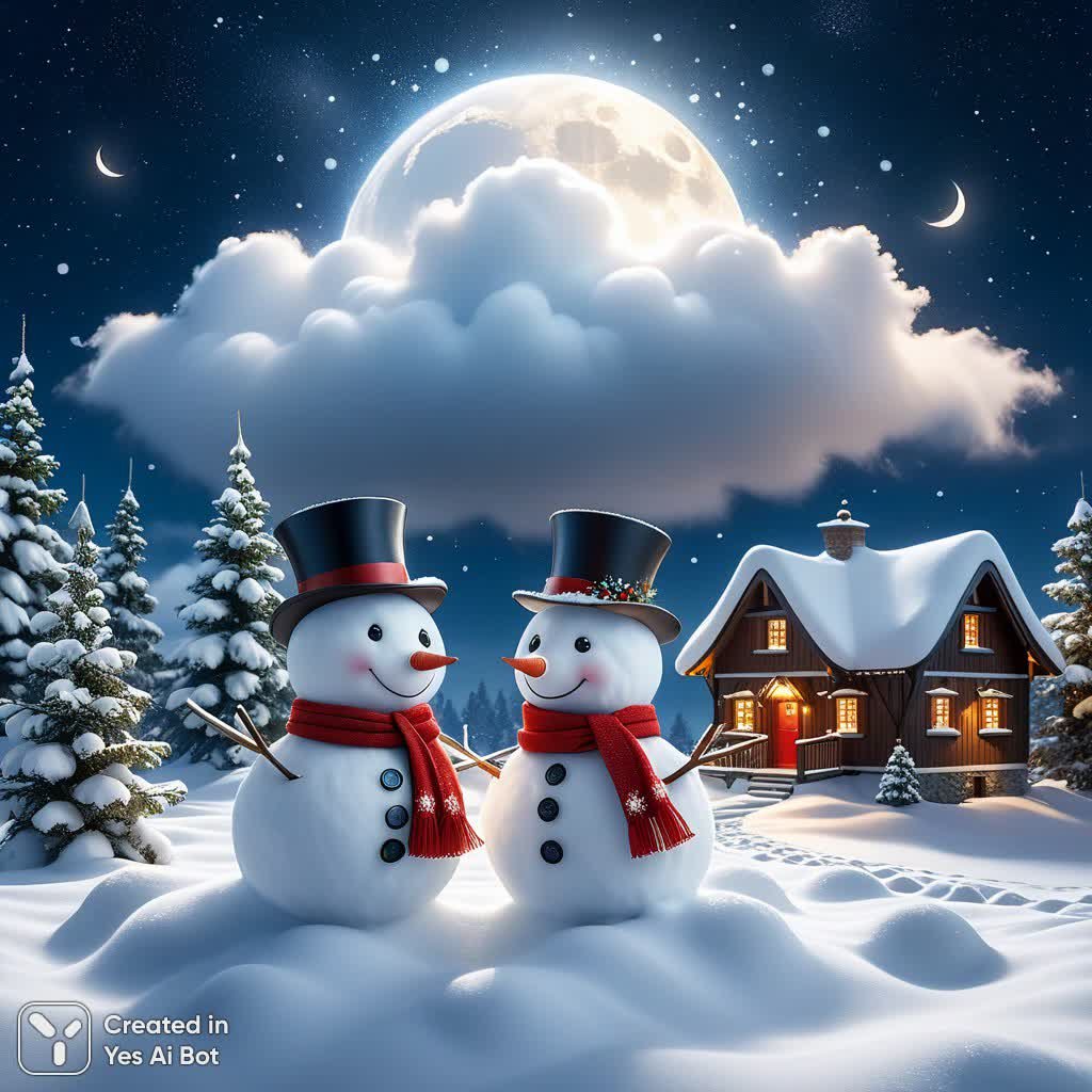 Невероятно детализированная трехмерная иллюстрация в стиле DALL-E 3 завораживает своей сюрреалистической красотой и очарованием зимней сказки. Вертикальный формат изображения (9:16) идеально подходит для мобильных устройств, позволяя полностью погрузиться в волшебную атмосферу. В центре композиции, на фоне темного синего звездного неба, парит огромная пушистая белая тучка круглой формы – словно небесный остров. Внутри этой воздушной крепости два милые снеговика нежно обнимаются, излучая тепло и уют в морозный день. Один из них одет в белую шапку и шарф, а другой дополнен ярким красным шарфом, добавляя игривости в картину. Изящные снежинки украшают верхнюю часть облака и его внутреннее пространство, создавая ощущение легкости и волшебства. В правом верхнем углу сияет яркая луна, подсвечивающая зимний пейзаж мягким светом. В нижней части изображения простирается миниатюрный заснеженный ландшафт с двумя уютными домиками, покрытыми пушистым белым одеялом, и стройными снежными соснами. На земле радостно стоят три маленьких снеговика, словно приветствуя зрителя в этот сказочный мир. Иллюстрация лишена каких-либо текстовых элементов, что позволяет полностью сконцентрироваться на визуальном великолепии и передать ощущение умиротворения и зимней безмятежности. Это настоящее произведение цифрового искусства, способное вызвать чувство радости и тепла даже в самый холодный день, приглашая зрителя окунуться в мир фантазий и волшебных снежных приключений. Каждая деталь проработана с невероятной точностью, создавая иллюзию реальности и поражая своей гиперреалистичностью