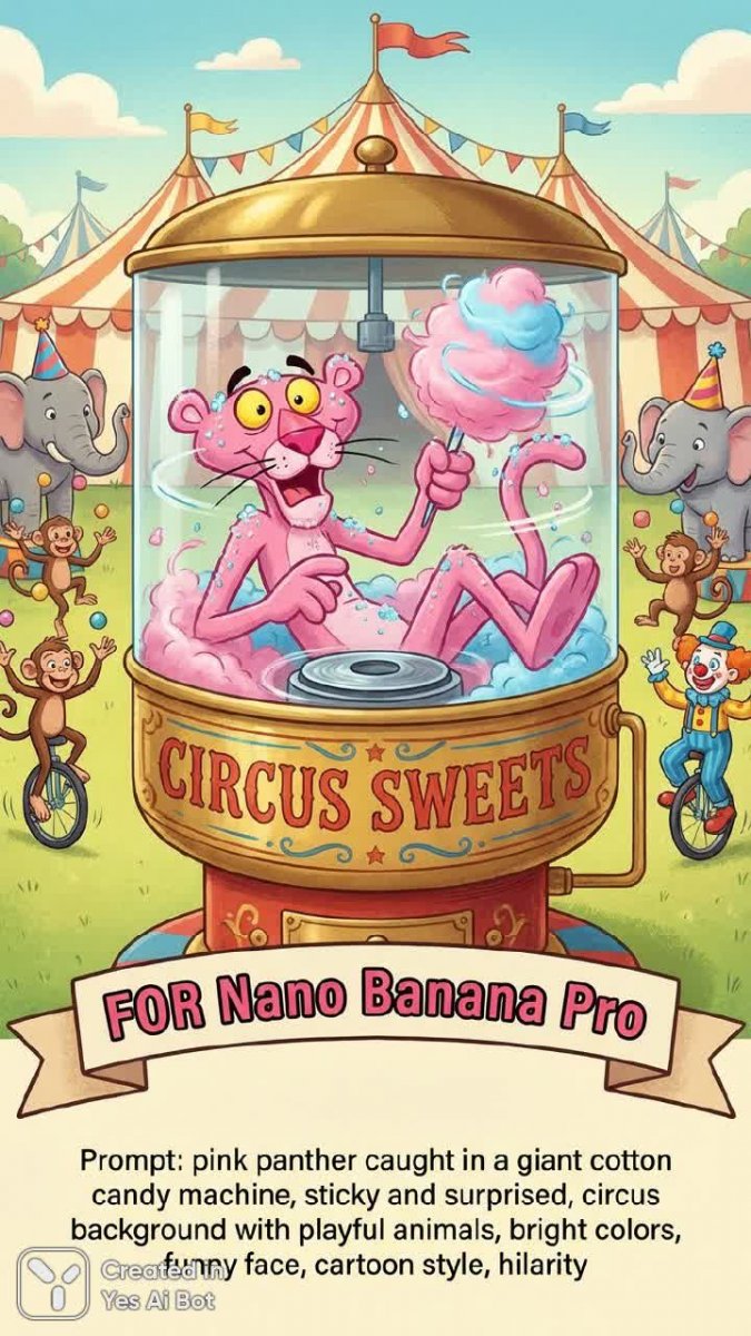 text: "FOR Nano Banana Pro" and Text: "Prompt: pink panther caught in a giant cotton candy machine, sticky and surprised, circus background with playful animals, bright colors, funny face, cartoon style, exaggerated hilarity".