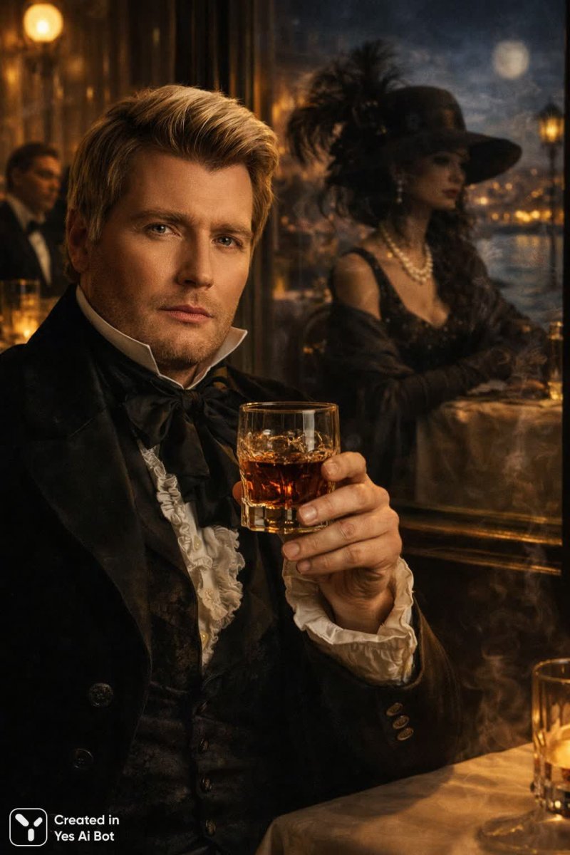 За образ героя взять и точно повторить образ с референс картинки 2,одеть его в костюм 19 века,и создать образ Евгения Онегина, используясь атмосферу ресторана с референс картинки 1,по тексту:Образ со стаканом спиртного