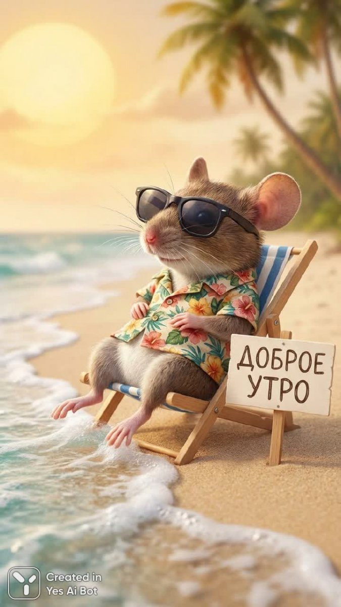 text on russian: "good morning!" a charming anthropomorphic mouse in dark sunglasses and a Hawaiian shirt lounges on the beach, with soft waves lapping at its tiny feet under a warm sun.
