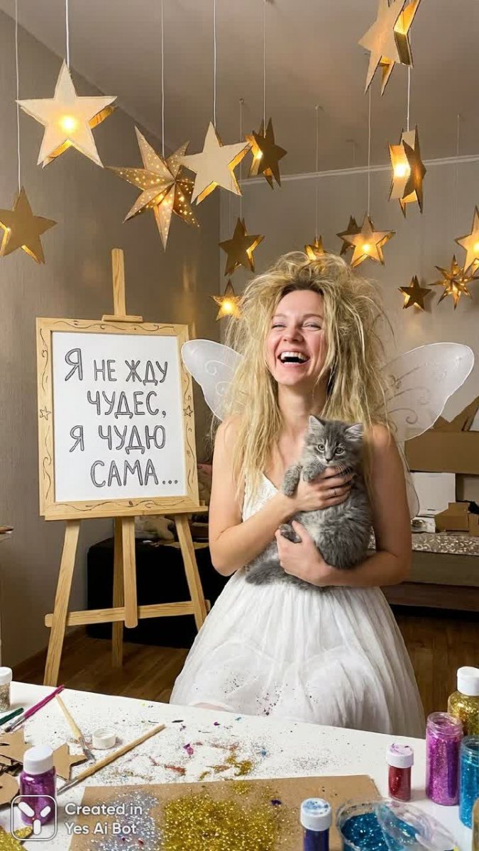 Волшебная иллюстрация, наполненная легкостью и очарованием. В центре композиции – жизнерадостная фея с роскошными светлыми волосами, облаченная в воздушное белое платье, которое словно соткано из лунного света. Рядом с ней игриво расположился маленький котенок, добавляющий картине нежности и уюта. Вокруг феи и котенка мерцают яркие звезды, создавая ощущение сказочного мира, где возможно все. Изображение сопровождается вдохновляющей цитатой на русском языке: 'Чудес не жду, чудю сама...' – это девиз сильной и независимой личности, способной создавать волшебство своими руками. Картина излучает позитив, оптимизм и веру в собственные силы, напоминая о том, что каждый из нас способен творить чудеса в своей жизни. Это прекрасный выбор для тех, кто ценит красоту, вдохновение и внутреннюю гармонию, а также идеальный подарок для близкого человека, который нуждается в поддержке и мотивации. Яркие цвета и детализированная проработка делают эту иллюстрацию настоящим произведением искусства, способным украсить любой интерьер и подарить хорошее настроение своим обладателям. Идеально подойдет для создания уникальных открыток, постеров или просто как источник вдохновения на каждый день
