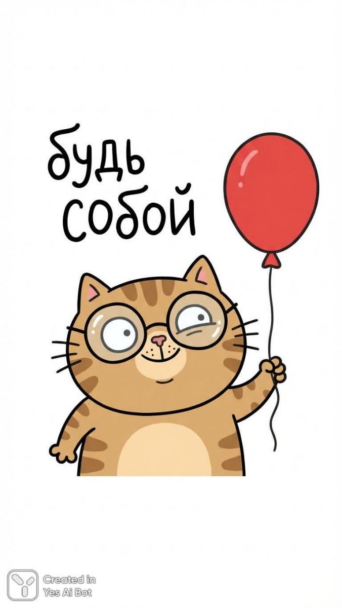 забавный мультяшный кот, в очках, держащий красный шарик, белый фон, надпись на русском: "будь собой", простой дизайн, юмористическая атмосфера
