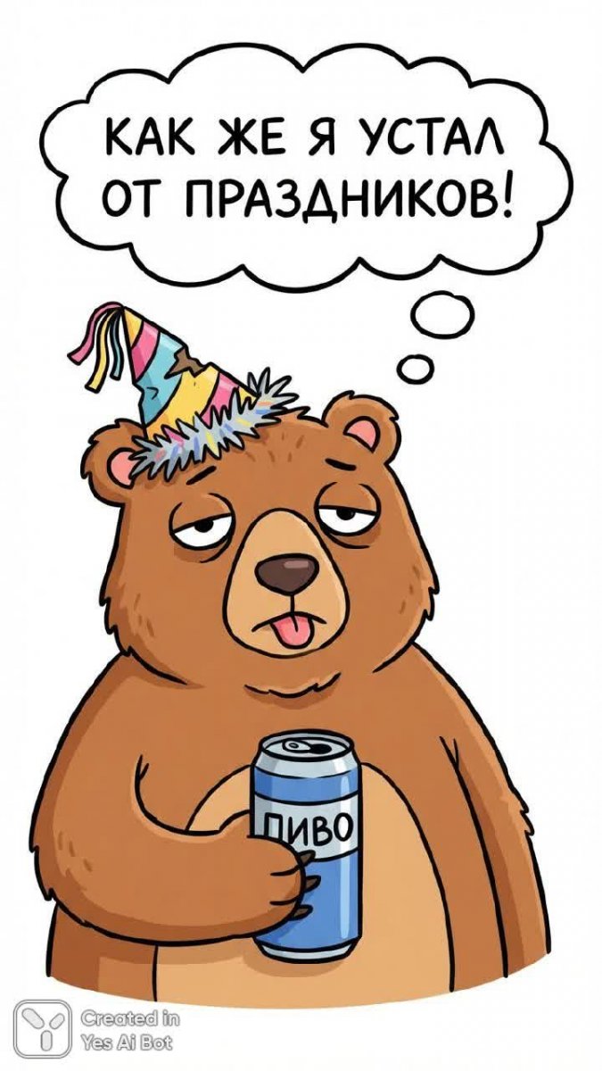 Этот забавный образ воплощает собой всеобщую предновогоднюю усталость и потребность в передышке. Добродушный медведь, одетый в праздничную шапку, с грустью смотрит на читателя, потягивая пенное из банки пива. Его взгляд выражает полное отчаяние перед суетой и хлопотами новогодних дней. Простая композиция с белым фоном акцентирует внимание на главном герое и его печальном послании. Яркая палитра цветов, несмотря на грустную тему, придает изображению нотку оптимизма и юмора. Ироничная надпись Как же я устал от праздников! моментально вызывает улыбку и отождествление у любого, кто хоть раз чувствовал себя перегруженным предновогодней гонкой. Мультяшный стиль делает персонажа максимально симпатичным и понятным, а простота исполнения подчеркивает искренность его эмоций. Изображение идеально подойдет для создания новогодних открыток, стикеров или как элемент оформления социальных сетей, чтобы выразить свою усталость от праздничного безумия с юмором и самоиронией. Это визуальное воплощение мечты о тихом вечере у камина с любимым напитком, вдали от шума и суеты