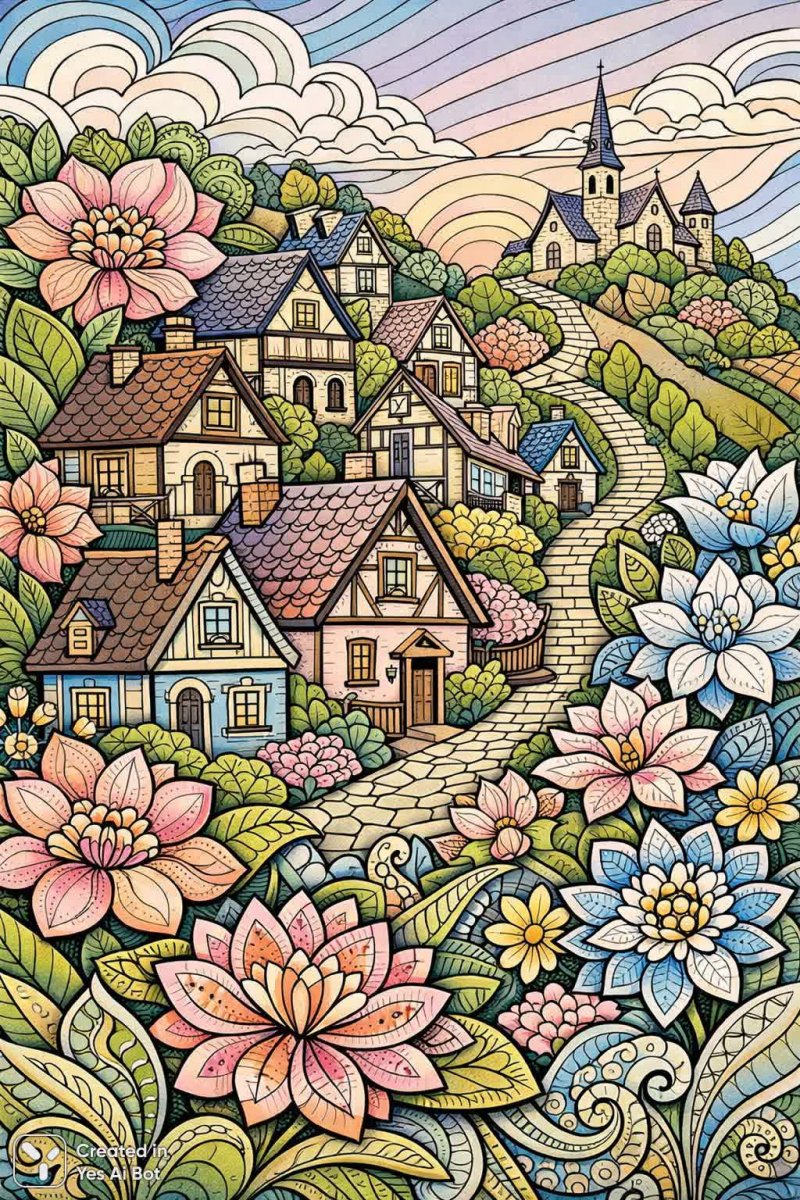 zentangle-inspired illustration of a cozy town on a hillside, featuring bold outlines and pastel colors, intricate floral patterns blooming around charming cottages.