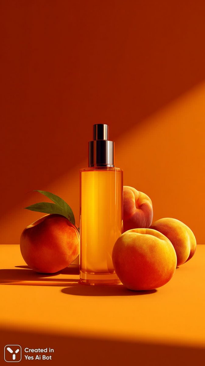 Роскошная сыворотка в современном стиле на фоне сочных персиков - Картинка, созданная ИИ Миджорни