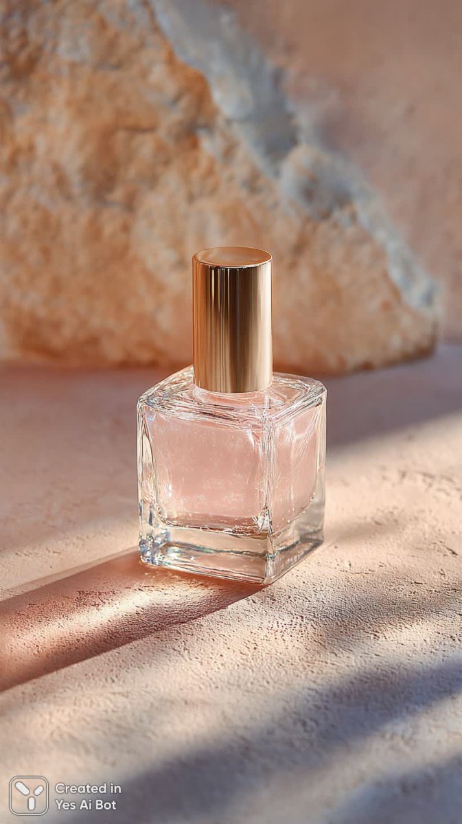 minimal mockup of a clear nail polish bottle displayed on a soft pastel backdrop, complemented by warm golden highlights and subtle textures. the focus on the product's smooth surface and glistening formulation creates a modern, chic aesthetic ideal for beauty photography.