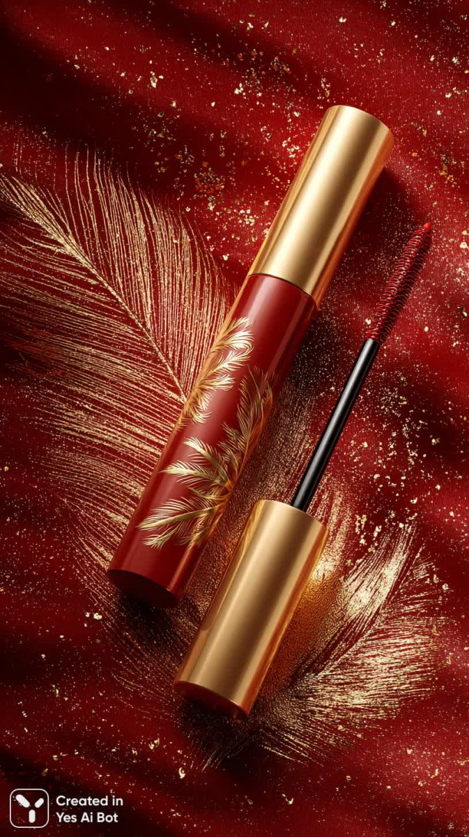 elegant advertising photo featuring an opened burgundy mascara tube, styled on a clean white surface with subtle golden accents. soft lighting enhances the deep color and texture of the product, creating a fresh and luxurious feel. high-resolution focus captures rich details and glossy reflections, suitable for cosmetic brand marketing.