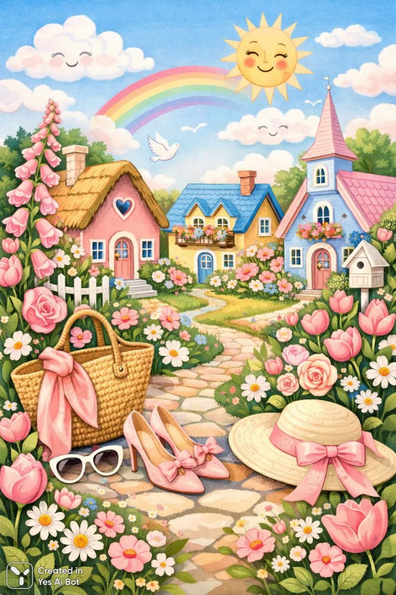 folk art illustration of a dreamy scene with pastel-toned houses, flowers blooming around them, and a cheerful sky, reflecting a charming cartoon style.