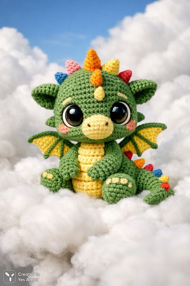 small crocheted dragon toy made of green and yellow yarn, big round eyes and tiny wings, body adorned with colorful spikes, sitting on a fluffy white cloud background, playful and whimsical.