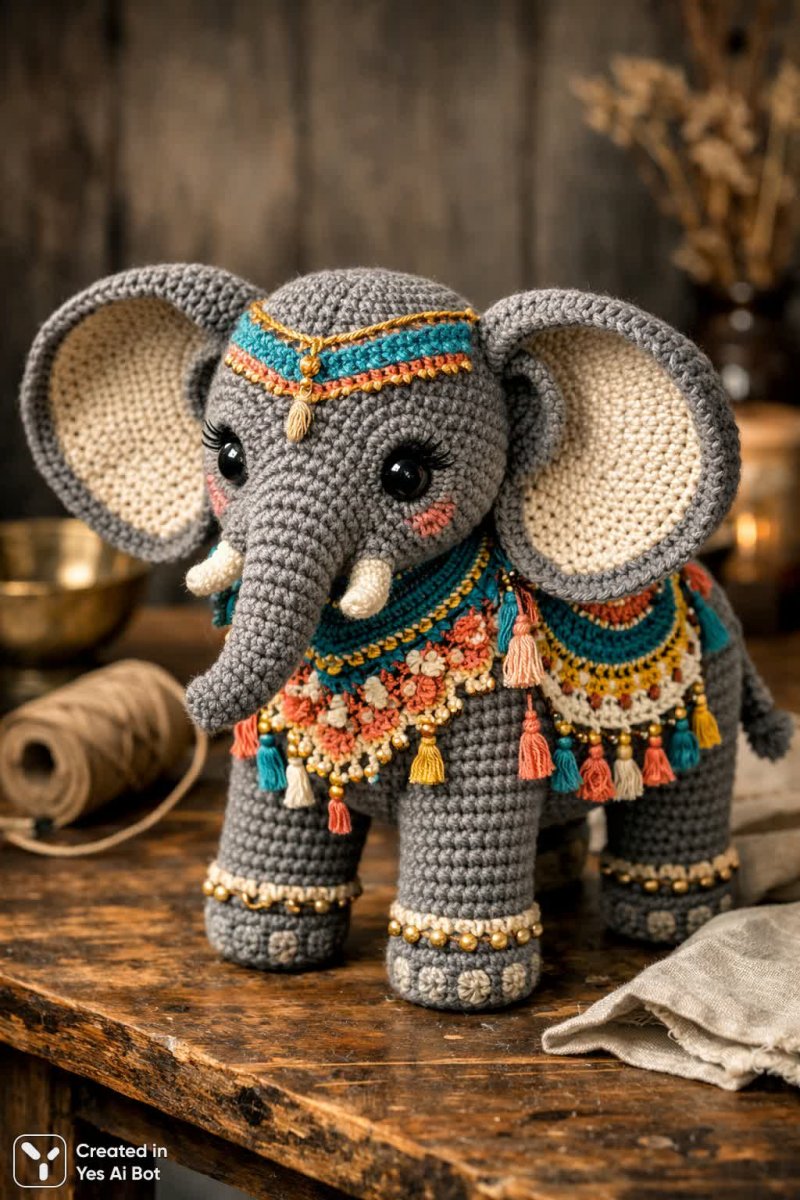 intricately designed crocheted elephant toy in muted gray, decorated with colorful blankets on its back, large ears and expressive eyes, standing on a wooden table, rustic and homely setting.