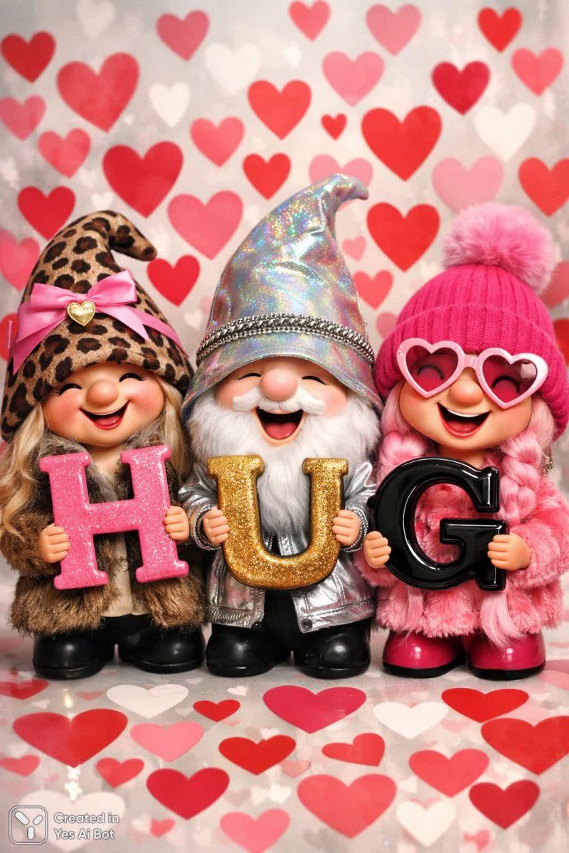 Трое веселых гномов в ярких и необычных шляпах с любовью держат буквы, складывающиеся в слово 'HUG'. Их лица излучают искреннюю радость и теплоту, создавая атмосферу безграничного счастья. Изображение выполнено в наивной манере, что придает ему особый шарм и очарование, напоминающее детские рисунки и сказки. Фон картины пестрит множеством разноцветных сердец – символом любви, дружбы и нежности, которые окружают этих забавных персонажей. Каждый гном обладает индивидуальным стилем в своей шляпе: один украшен яркими цветами, второй - игривыми лентами, а третий - блестящими звездами, что подчеркивает их уникальность и добавляет образу больше колорита. Общий стиль изображения – мультяшный, с использованием ярких цветов и простых форм, что делает его привлекательным для зрителей всех возрастов. Картина излучает позитив и дарит ощущение уюта и тепла, напоминая о важности искренних объятий и добрых чувств. Вся композиция наполнена оптимизмом и радостью жизни, передавая простое, но глубокое послание – цените моменты счастья и делитесь любовью с окружающими