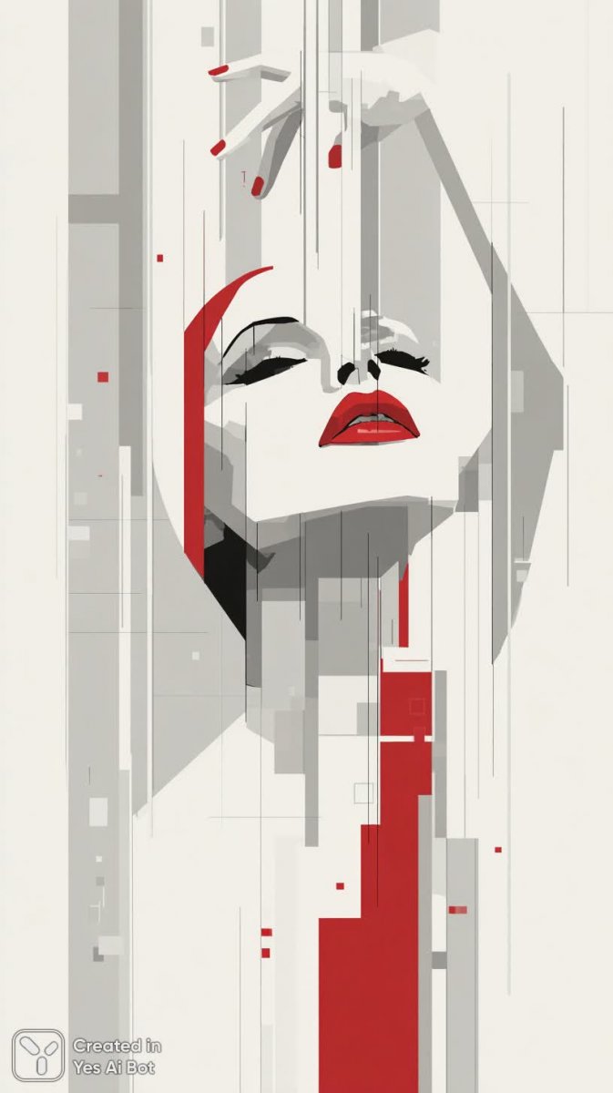 Изящный портрет женщины, выполненный в черно-белой гамме, подчеркивает драматизм образа благодаря яркому акценту – насыщенному красному цвету на губах. Лицо выражает задумчивость и уверенность одновременно, а слегка приподнятая рука над головой добавляет динамики и загадочности композиции. Фон, состоящий из вертикальных линий, создает ощущение строгости и лаконичности, усиливая минималистичный стиль изображения. Векторная графика позволяет передать четкость линий и простоту форм, характерные для современного дизайна. Использование ограниченной палитры цветов и геометрических элементов придает портрету элегантность и современный вид. Эта работа демонстрирует гармоничное сочетание классической темы – женского портрета – с передовыми художественными приемами. Картина завораживает своей простотой, но в то же время несет в себе глубокий смысл и эмоциональную выразительность. В целом, это стильное и запоминающееся произведение искусства, которое идеально подойдет для оформления различных медиапроектов, требующих минимализма и лаконичности