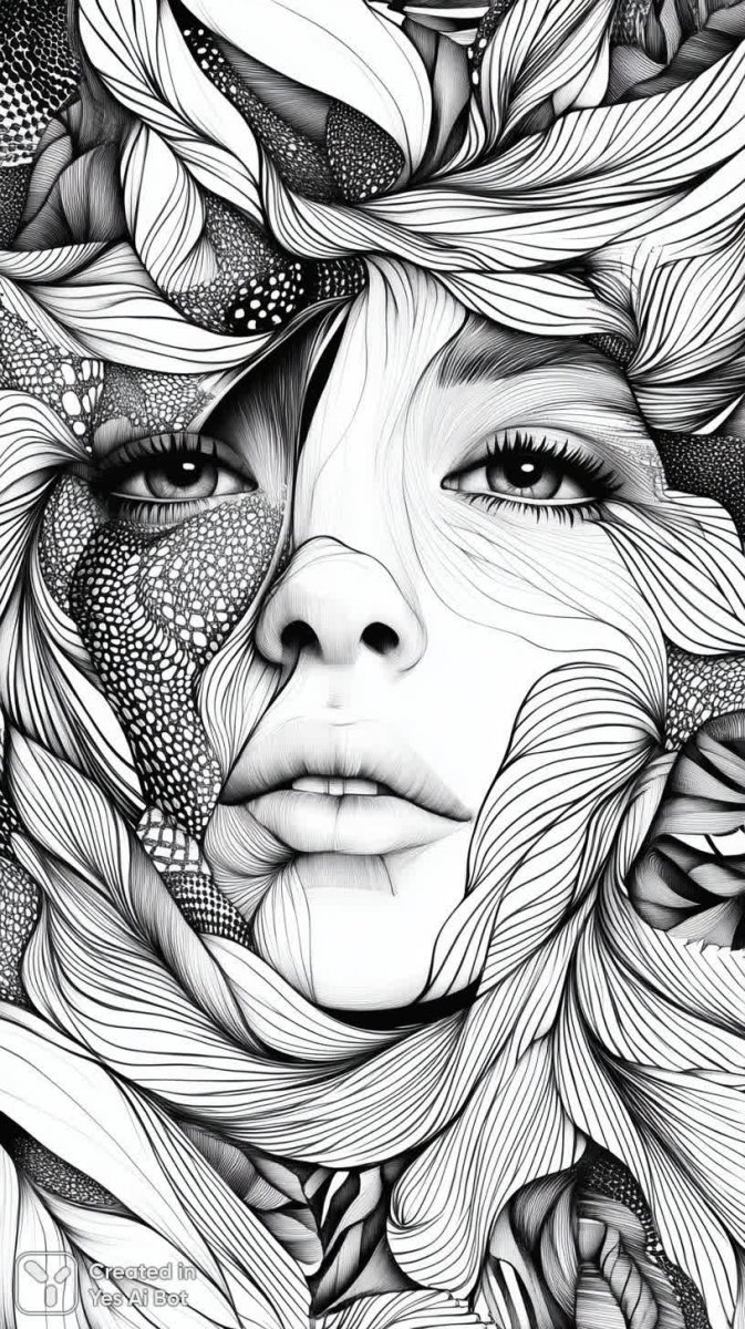 surreal female face, swirling lines and patterns, black and white palette, doodling, zentangle motifs, ornamental foliage, bold graphic style, detailed ink drawing, coloring page illustration.