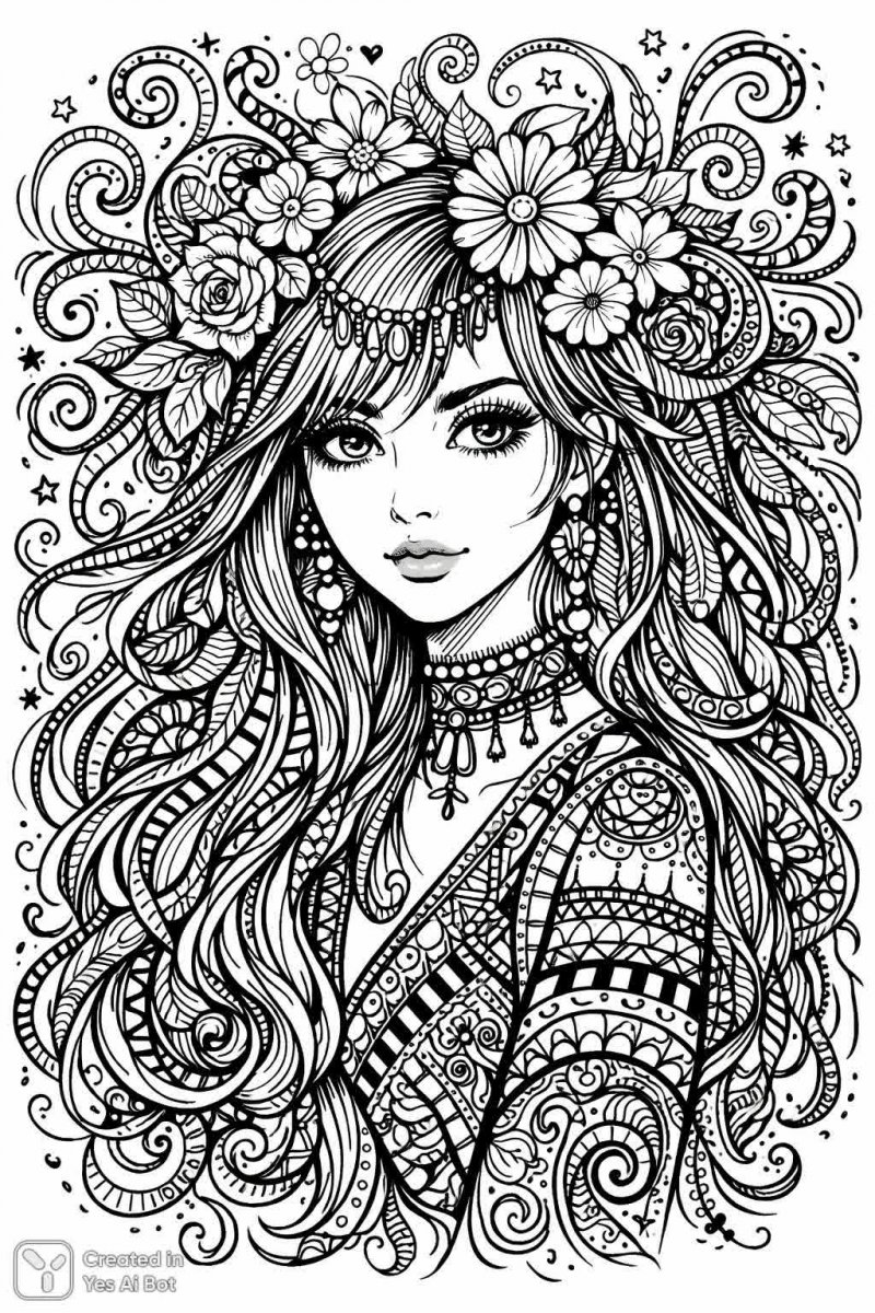 Завораживающий портрет юной девушки, сотканный из тонких и смелых линий в технике ink drawing и line art. Изображение пронизано духом фэнтези и волшебства, воплощенное в причудливых узорах и декоративных элементах, вдохновленных zentangle. Длинные волосы девушки украшены цветами и витиеватыми завитушками, образуя гармоничный тандем с общим стилем рисунка. Каждая деталь проработана с любовью к деталям, создавая ощущение глубины и многослойности. Энергичные линии, напоминающие эскизы и зарисовки, вплетаются в замысловатые узоры, придавая работе динамичность и живость. Этот рисунок идеально подойдет для любителей doodle style и станет прекрасным вдохновением для создания собственных художественных шедевров. Использование черно-белой палитры позволяет сосредоточиться на красоте линий и сложных композициях, а также открывает возможности для раскрашивания в стиле coloring book design, даря свободу самовыражения художнику. Это не просто рисунок – это погружение в мир фантазий и творчества, где каждая линия рассказывает свою историю. Идеальный выбор для тех, кто ценит оригинальность, детализацию и уникальный художественный стиль