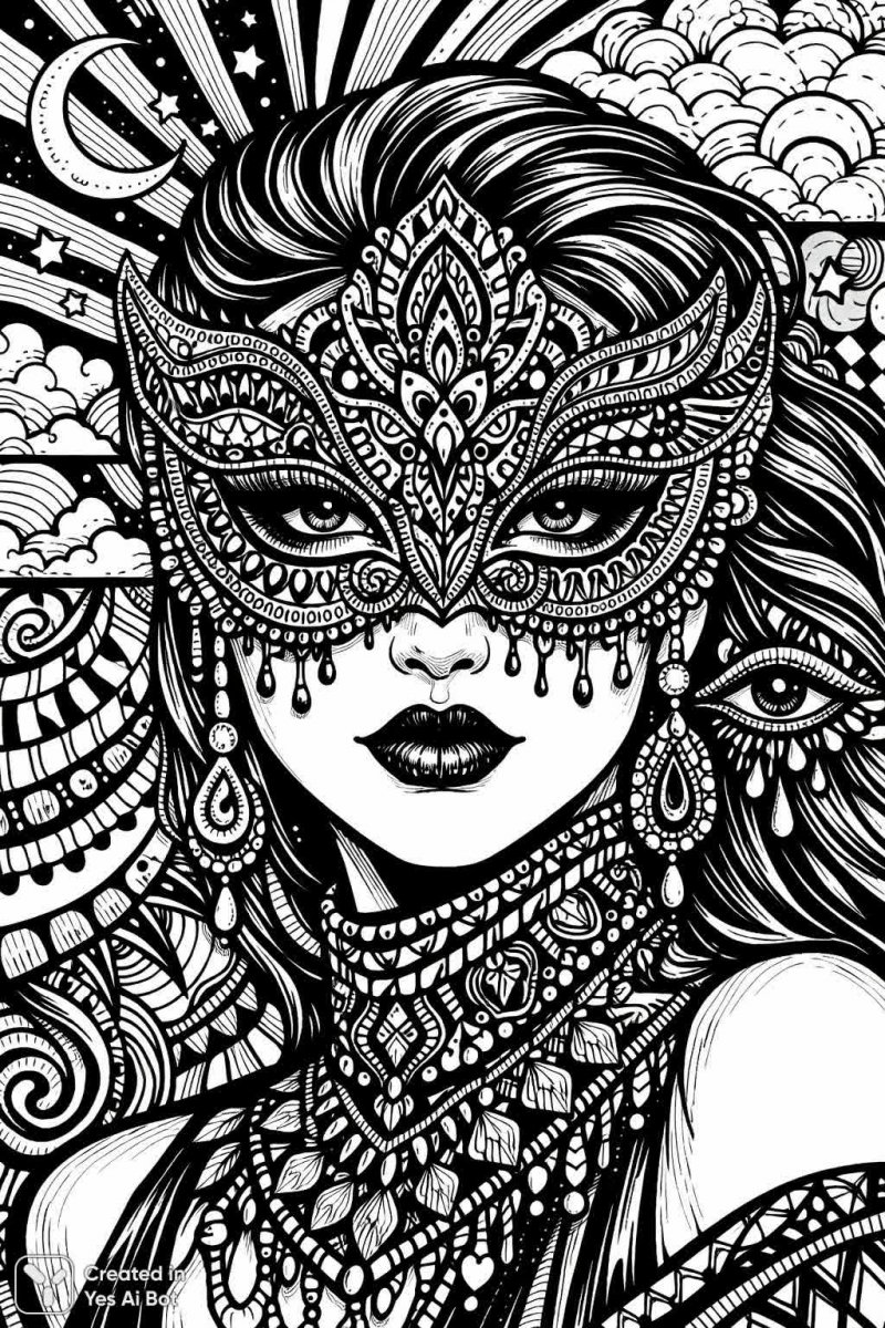 ink drawing, bold line, female mask design, detailed zentangle artwork, ornate decorations, contrasting lines and shapes, surreal background, intricate graphic illustration, black and white.