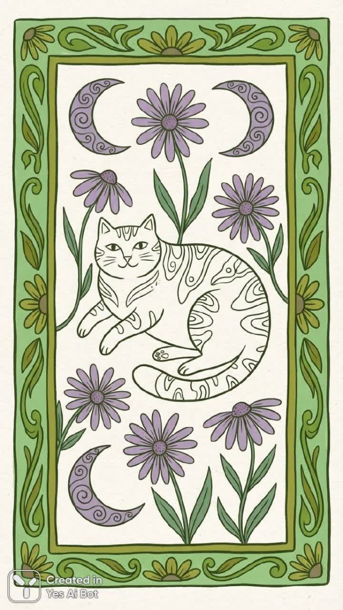folk art, whimsical design, a line drawing of a lounging cat, nestled among purple daisies and crescent moons, eye-catching green border, simplistic and cheerful.