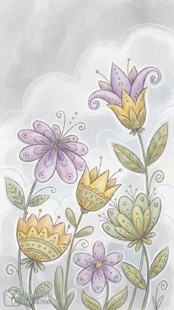 illustration, a playful composition of stylized flowers, featuring intricate details and colors like purple, yellow, and green against a soft gray background.