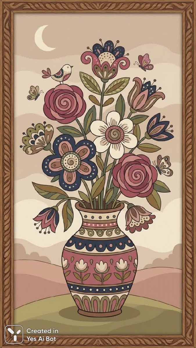 Яркое воплощение народного искусства, представляющее собой красочное изобилие причудливых цветов самых разнообразных форм. Палитра исполнения поражает смелостью сочетаний: насыщенный розовый гармонично переплетается с глубоким темно-синим и землисто-коричневым, создавая ощущение живой энергии и неповторимого художественного настроения. Каждая деталь – это проявление самобытного мастерства, передающее дух традиционных ремесел и радушие народного творчества. Композиция излучает позитив, наполняя пространство атмосферой тепла и уюта. Это не просто изображение цветов, а настоящий гимн красоте природы, воплощенный в уникальном стиле фольклорного искусства. Насыщенные тона и игривые формы делают этот арт-объект визуально привлекательным и запоминающимся, способным украсить любой интерьер и подарить хорошее настроение своим обладателям. В каждом мазке чувствуется любовь к традициям и стремление передать неповторимую атмосферу народной культуры. Это произведение искусства – прекрасный пример того, как простое может стать гениальным благодаря таланту мастера и его умению видеть красоту в окружающем мире