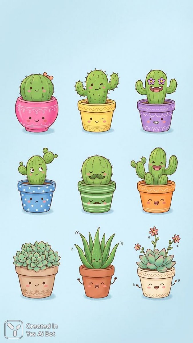 Очаровательная коллекция из девяти иллюстраций кактусов в милых горшочках! Каждый кактус обладает своим неповторимым и забавным выражением лица, что создает атмосферу игривости и тепла. Иллюстрации аккуратно расположены в виде сетки, приглашая зрителя рассмотреть каждую деталь. В первом ряду выделяется яркий розовый горшок с улыбающимся кактусом, излучающим позитив и радость. Второй ряд представляет собой два горшка с необычными забавными мордочками, добавляя элемент сюрреализма и юмора. Третий ряд содержит три очаровательных суккулента в горшочках, демонстрируя разнообразие форм и текстур этих неприхотливых растений. Нежный голубой фон мягко подчеркивает красоту кактусов и создает ощущение спокойствия и умиротворения. Эта коллекция идеально подойдет для оформления интерьера, создания уникальных открыток или использования в качестве графического элемента для различных проектов. Яркие цвета и милые детали делают эти иллюстрации привлекательными для широкой аудитории, от детей до взрослых, ценящих оригинальный дизайн и позитивные эмоции. Каждое изображение – это маленькое произведение искусства, способное украсить любое пространство и подарить хорошее настроение. Это прекрасный выбор для любителей кактусов, растений и всего необычного!