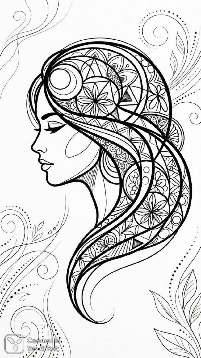 Изысканный черно-белый рисунок, выполненный в технике туши и контурного рисунка, представляет собой завораживающую абстракцию женского портрета. Композиция гармонично сочетает в себе утонченные декоративные элементы из изображений цветов и строгие геометрические формы, создавая ощущение легкости и воздушности. Акцент сделан на минимализме, проявляющемся в лаконичности линий и отсутствии лишних деталей. Смелые линии формируют четкий контур изображения, подчеркивая его графическую выразительность и придают работе особую динамику. Сложные узоры, переплетающиеся между собой, создают эффект глубины и многослойности, приглашая зрителя к детальному рассмотрению каждой линии. В целом, работа демонстрирует высокий уровень художественного мастерства и является прекрасным образцом современного графического искусства, сочетающего в себе элементы абстракции, декоративности и минимализма. Это визуальное воплощение гармонии между органическим миром цветов и строгой геометрией линий, создающее неповторимую атмосферу элегантности и загадочности