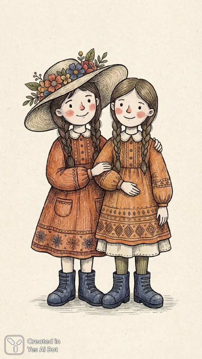 На акварельной иллюстрации, выполненной в стиле наивного искусства и минимализма, изображены две девочки в ярких народных костюмах. Одна девочка одета в оранжевое платье с голубыми сапожками и необычной шляпой, украшенной цветами. Вторая – в стильном наряде, также акцентированном яркими деталями. Их лица имеют преувеличенные черты, что добавляет им сказочности и очарования. Светло-бежевый фон помогает выделить детали костюмов и выразительные лица девочек. Картина создает атмосферу умиления, ностальгии и беззаботности детства, приглашая зрителя в мир волшебства и веселых игр. Сочетание фольклорных мотивов с современными тенденциями в иллюстрации делает это произведение искусства уникальным и привлекательным для ценителей прекрасного. Рисунок выполнен нейросетью Nano Banana, используя запрос на создание рисунка чернилами двух девочек в оранжевом платье и голубых сапожках с преувеличенными чертами, одной из которых на голове шляпа, украшенная цветами, на светло-бежевом фоне. Работа выполнена в стилях иллюстрации и детализации.