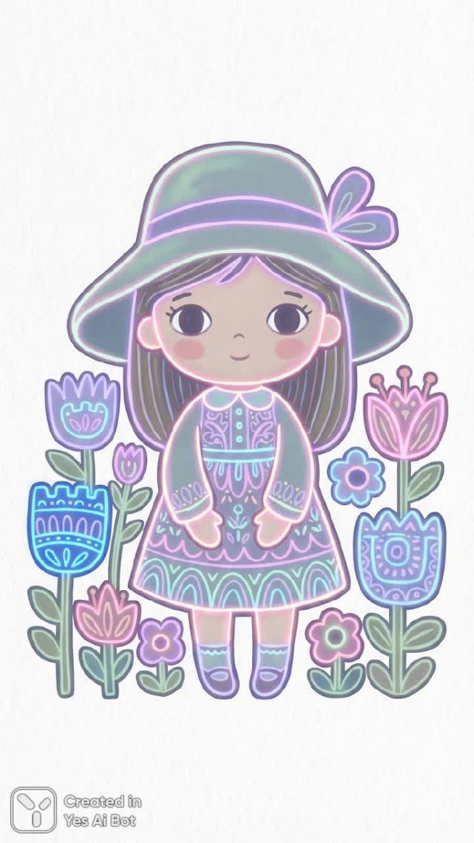 Яркая неоновая иллюстрация, изображающая девушку в полосатом платье и большой шляпе, утопающую в буйстве разноцветных цветов. Стиль рисунка нарочито упрощен, с элементами примитивизма, фигуры схематичны и лаконичны. Белый фон позволяет полностью сконцентрироваться на насыщенности красок и выразительности композиции. Вся работа выполнена в захватывающем стиле дикого искусства – спонтанного, энергичного и полного жизни. Девушка смотрит прямо на зрителя, устанавливая непосредственный контакт и создавая ощущение вовлеченности в происходящее. Кажется, будто она приглашает вас окунуться в этот яркий и фантазийный мир, где царит красота и безграничная свобода самовыражения. Это не просто иллюстрация, а скорее окно в волшебную реальность, наполненное радостью, оптимизмом и творческой энергией. Ощущается легкая ностальгия по детским рисункам, когда воображение было единственным пределом для создания прекрасного. Подобная работа идеально подойдет для оформления интерьера в современном стиле или как часть арт-проекта, посвященного красоте природы и человеческой фантазии