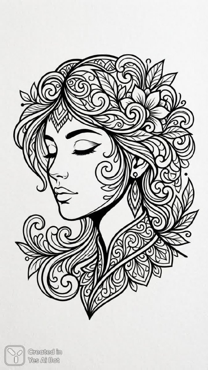 ink drawing, line art, bw doodle art, profile of a woman, ornamental features and floral designs, artistic stylization, contrasting lines, mysterious look, modern graphic.