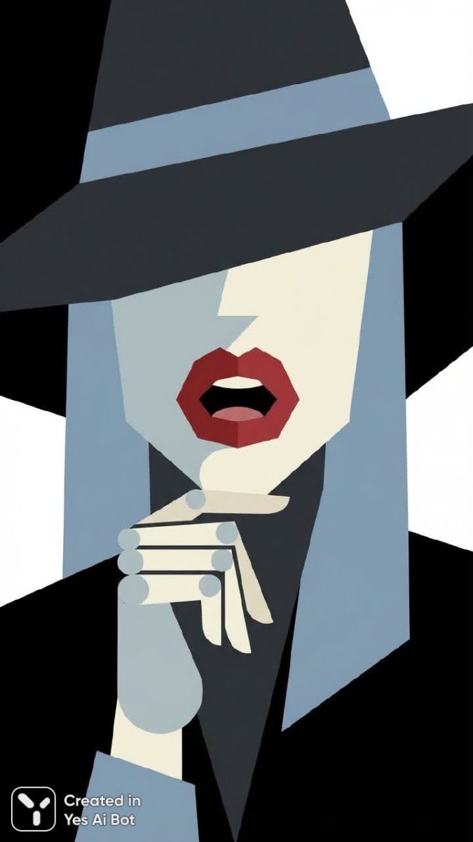 Изящный портрет женщины, воплощенный в элегантной черно-белой композиции. Лицо, обрамленное широкими полосами черного цилиндра, выражает задумчивость и утонченность. Приоткрытый рот демонстрирует яркие алые губы, становясь акцентом на фоне лаконичного дизайна. Рука, нежно покоящаяся на подбородке, добавляет портрету атмосферу размышления и внутренней сосредоточенности. Плоские формы и минималистичный фон подчеркивают современный стиль изображения, создавая ощущение изысканности и модной актуальности. Этот образ – воплощение элегантной простоты, где контраст черного и белого, а также яркий акцент на губах, формируют неповторимый визуальный эффект, отражающий уверенность и утонченный вкус. Идеально подойдет для иллюстраций в журналах о моде, рекламы косметики или как стильное украшение интерьера, добавляющее нотку ар-деко. Композиция излучает спокойствие и благородство, приковывая взгляд своей лаконичностью и выразительностью