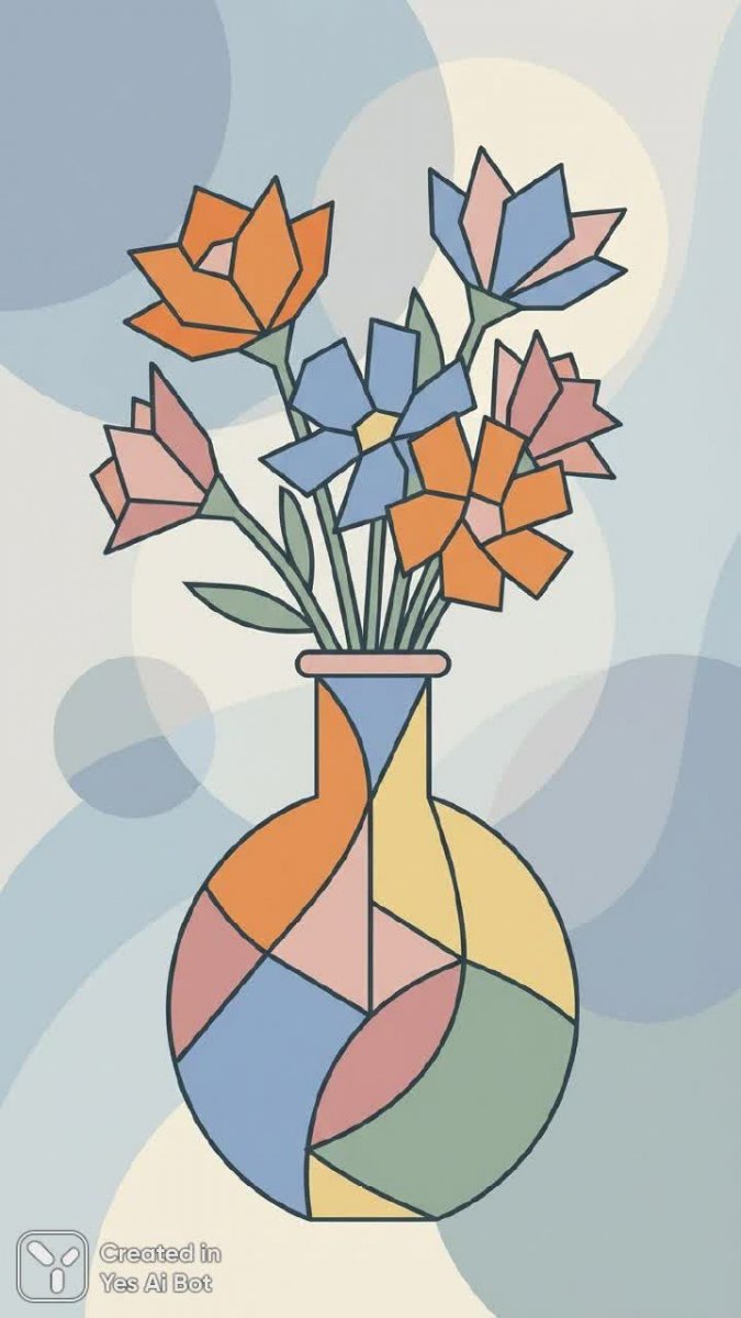 Изображение, созданное нейросетью Nano-Banana в стилях кубизма и минимализма, представляет собой элегантную иллюстрацию. В центре композиции – округлый вазон с узким горлышком, наполненный геометрическими цветами разнообразной формы. Фон выполнен в яркой цветовой гамме, где сочные оранжевые, глубокие синие и нежные розовые оттенки переплетаются друг с другом, создавая богатую и визуально привлекательную картину.