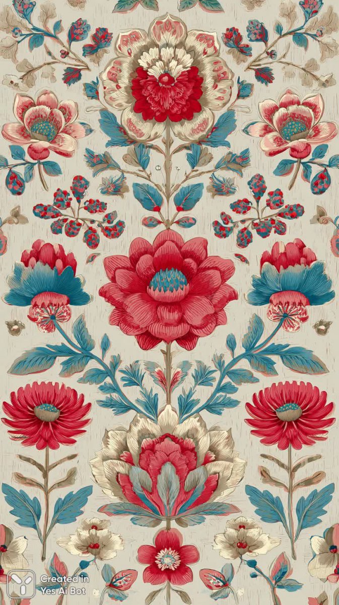 illustration, a colorful collection of geometric flower designs in shades of red, teal, and beige, set against a soft neutral background, showcasing intricate patterns.