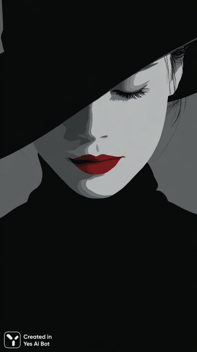 Изящный портрет женщины в стиле минималистичного векторного искусства завораживает своей простотой и элегантностью. Черно-белая композиция акцентирует внимание на выразительном лице с закрытыми глазами, словно погруженном в глубокую задумчивость или сладкий сон. Объемная широкополая черная шляпа, кокетливо наклоненная набок, добавляет образу загадочности и шарма. Яркая деталь – смелый красный помада – создает эффектный контраст с монохромной гаммой и подчеркивает чувственность модели. Фон представляет собой лаконичное сочетание горизонтальных полос, не отвлекая внимания от главного объекта изображения. Вся работа выполнена в духе минимализма, где каждая линия и каждый элемент имеют значение, создавая гармоничную и стильную композицию. Это изображение – воплощение утонченности и сдержанной красоты, идеально подходящее для использования в дизайне, рекламе или как самостоятельное произведение искусства. Оно передает атмосферу спокойствия и загадочности, приковывая взгляд своей лаконичностью и элегантностью, что делает его визуально привлекательным и запоминающимся. Композиция отличается чистотой линий и четкостью форм, характерными для векторной графики, создавая ощущение легкости и воздушности