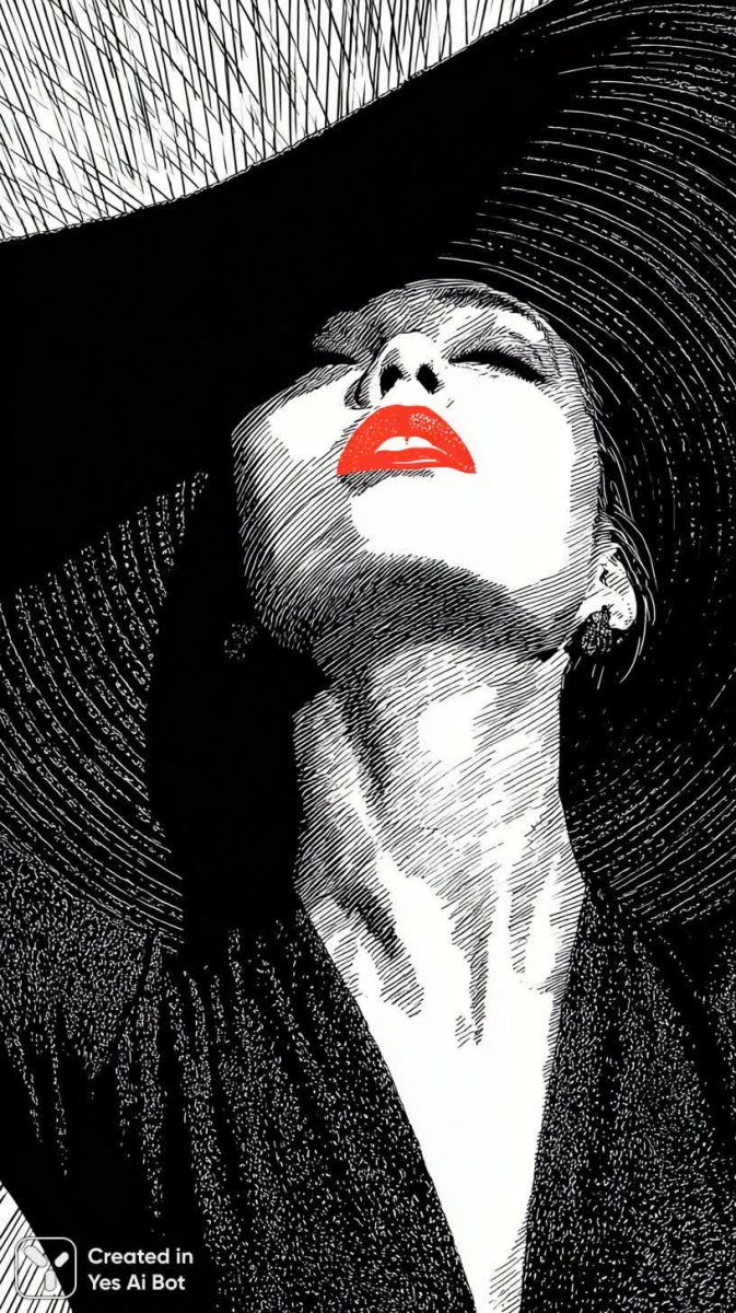 Изображение представляет собой элегантный портрет современной женщины, выполненный в стиле минимализма и векторной графики. Акцент сделан на лице с яркой красной помадой, создающей драматический эффект. Черная широкополая шляпа добавляет загадочности, а поднятая рука над головой придает динамизм композиции. Фон черно-белый, с диагональными линиями, что усиливает графичность и современность изображения. Контраст между красной помадой и монохромным фоном подчеркивает красоту и силу женского лица. Использование векторной графики обеспечивает четкость линий и лаконичность деталей, характерные для минимализма. Образ воплощает уверенность, стиль и современную эстетику, сочетая классические элементы моды с передовыми тенденциями в искусстве. Подходит для иллюстраций, рекламы или арт-проектов, стремящихся к простоте и выразительности. Впечатляющий акцент на губах подчеркивает женственность и привлекательность, создавая ощущение изысканности и элегантности. Изображение сгенерировано нейросетью Midjourney по запросу, описывающему женщину с красной помадой, шляпой, поднятой рукой и черно-белым фоном в стиле современной минималистичной векторной графики.