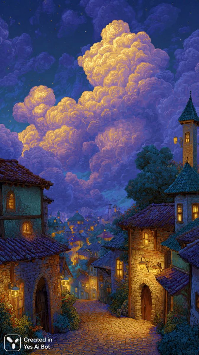 folk art illustration of a charming village at night, with bright hues and detailed elements like paths and clouds, creating an imaginative and cozy atmosphere.