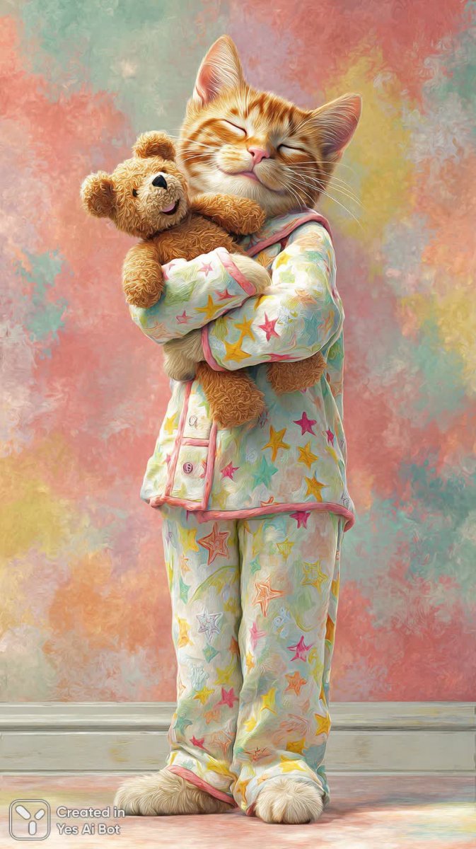 Забавный котик в пижаме с принтом звезд, изображенный в фотореалистичной манере. Пухлый персонаж демонстрирует игривое настроение, сидя в удобной позе и крепко прижимая к себе плюшевого мишку. Выражение мордочки кота вызывает улыбку – это сочетание невинности и комичности, которое делает его образ особенно привлекательным. Яркий, красочный фон создает атмосферу тепла и уюта, а композиция выдержана с использованием объектива 24 мм и слегка приподнятого угла обзора, что добавляет динамики и глубины изображению. Этот мультяшный котик выглядит невероятно мило и забавно, словно сошел со страниц детской книжки или ожил прямо из волшебного сна. Вся сцена продумана до мелочей, чтобы передать ощущение радости, беззаботности и игривости, что делает этот образ запоминающимся и приятным для восприятия. Детализированная текстура шерсти и ткани пижамы, а также реалистичное освещение подчеркивают мастерство художника и создают эффект присутствия. Это не просто рисунок – это живая картина, наполненная позитивом и хорошим настроением