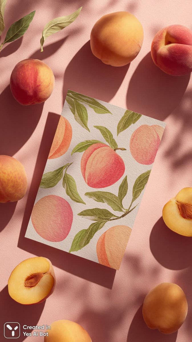 Изысканный натюрморт, сочетающий в себе текстуру бумаги и сочность фруктов. В центре композиции – горизонтально расположенная открытка формата А5, деликатно контрастирующая с окружением из спелых персиков. Цельные плоды, разбросанные вокруг, создают ощущение летнего изобилия и щедрости природы, а разрезанный персик демонстрирует его аппетитный внутренний вид. Яркое освещение студии подчеркивает насыщенность оттенков: от нежного персикового до глубокого золотистого, добавляя сцене роскоши и утонченности. Каждая деталь – будь то бархатная кожица фруктов или фактурная поверхность бумаги – проработана с максимальной тщательностью, создавая ощущение объема и реалистичности. Композиция излучает атмосферу спокойствия, гармонии и эстетического наслаждения, приглашая зрителя погрузиться в мир свежих красок и изысканных текстур. Это не просто фотография, а настоящее произведение искусства, запечатлевшее момент красоты и совершенства, где каждый элемент играет свою важную роль в создании единого гармоничного образа. Вся сцена пронизана атмосферой уюта и тепла, пробуждая приятные ассоциации с летним отдыхом и наслаждением простыми радостями жизни