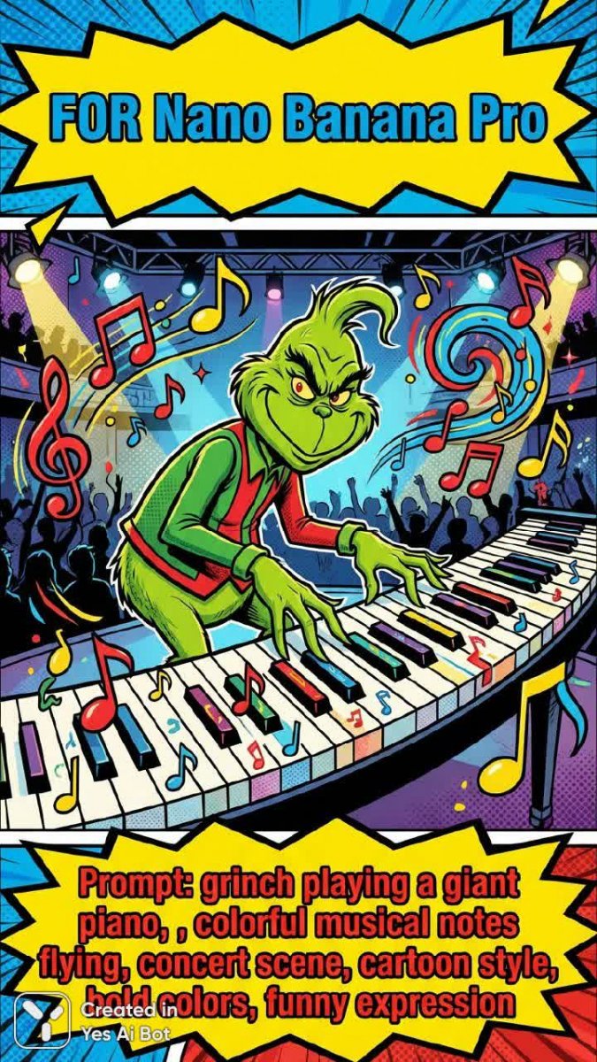 Яркий комикс-баннер посвящен инновационному устройству Nano Banana Pro. Центральное изображение демонстрирует забавную сцену: знаменитый Гринч с энтузиазмом играет на огромном пианино. Картина выполнена в мультяшной стилистике, используя насыщенные и смелые цвета для создания позитивного и энергичного настроения. Вокруг Гринча парят красочные музыкальные ноты, подчеркивающие атмосферу концерта и добавляющие динамизма композиции. Выражение лица персонажа – комичное и преувеличенное, что усиливает юмористический эффект всей сцены. Этот баннер идеально подойдет для привлечения внимания к продукту Nano Banana Pro, создавая ассоциацию с весельем, инновациями и нестандартным подходом. Дизайн выполнен в характерном стиле комиксов с акцентом на детали и яркие цветовые решения, что делает его запоминающимся и привлекательным для широкой аудитории. Сочетание узнаваемого персонажа Гринча и музыкальной тематики гарантирует интерес и вызывает положительные эмоции у потенциальных покупателей, формируя благоприятное восприятие бренда и продукта. Вся композиция тщательно продумана для максимального визуального воздействия и эффективной коммуникации с целевой аудиторией
